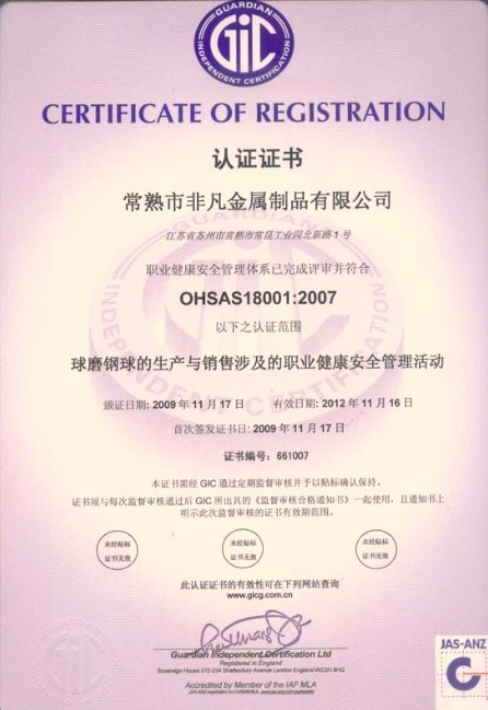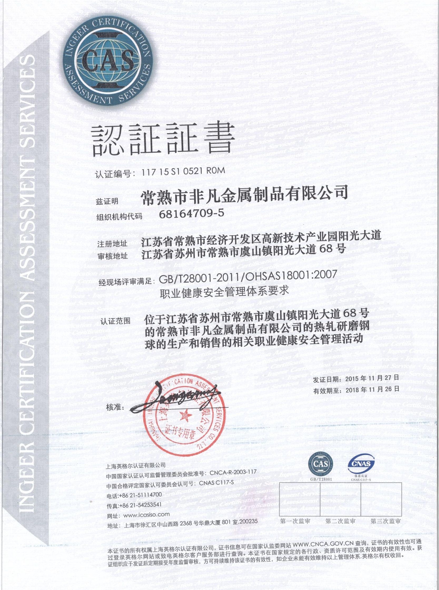 OHSAS18001體系認證書